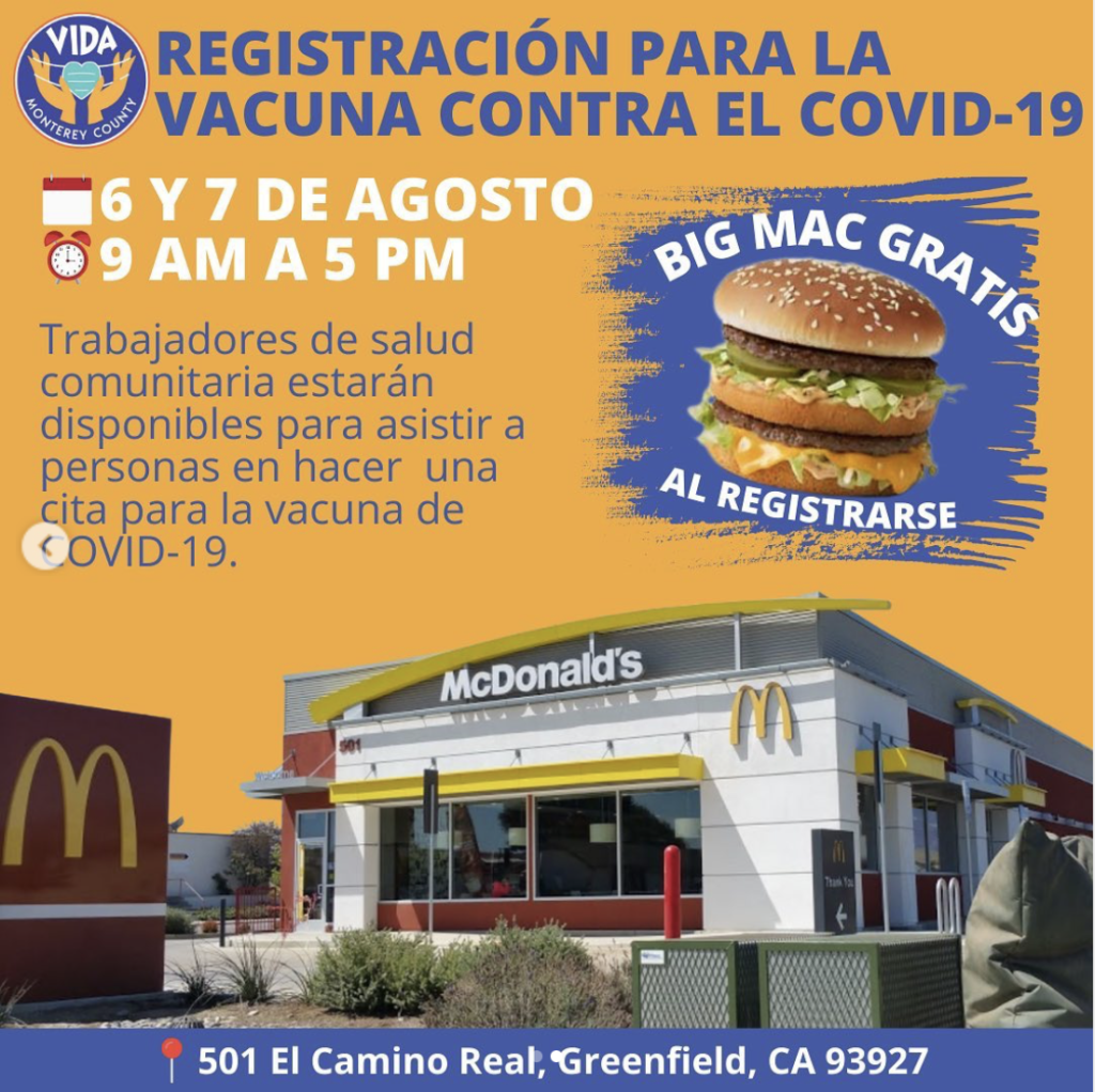 A flyer advertising a vaccine clinic, with free Big Macs to all who register.